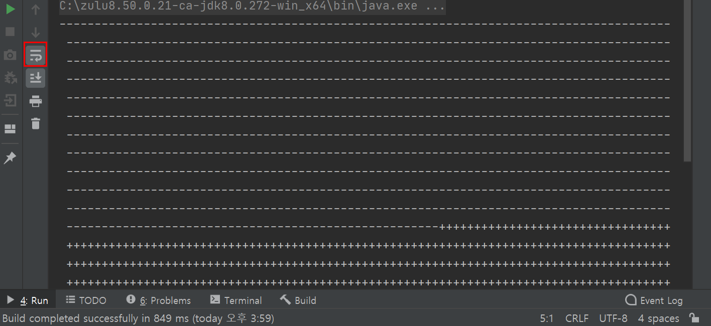 콘솔 창의 좌측 아이콘에서 Soft-Wrap 버튼을 클릭하면 자동 줄바꿈이 적용된다.