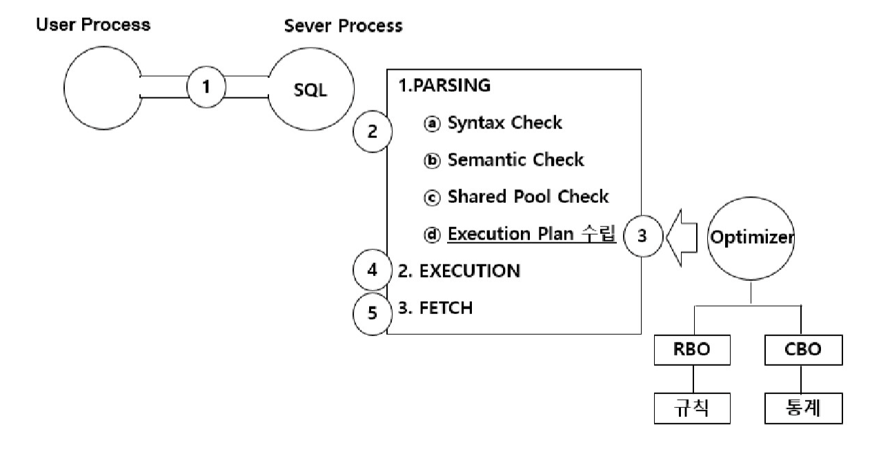 1. Parsing (Query의 문법적, 의미적 오류 체크, 재사용 가능 SQL 확인, 쿼리실행계획 수립 등)