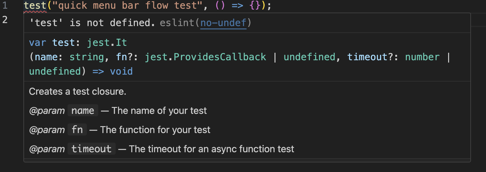 테스트코드를 작성했는데 VSCode에서 아래의 오류 상세처럼 'test' is not defined.라는 eslint의 no-undef유형의 오류가 발생했다.