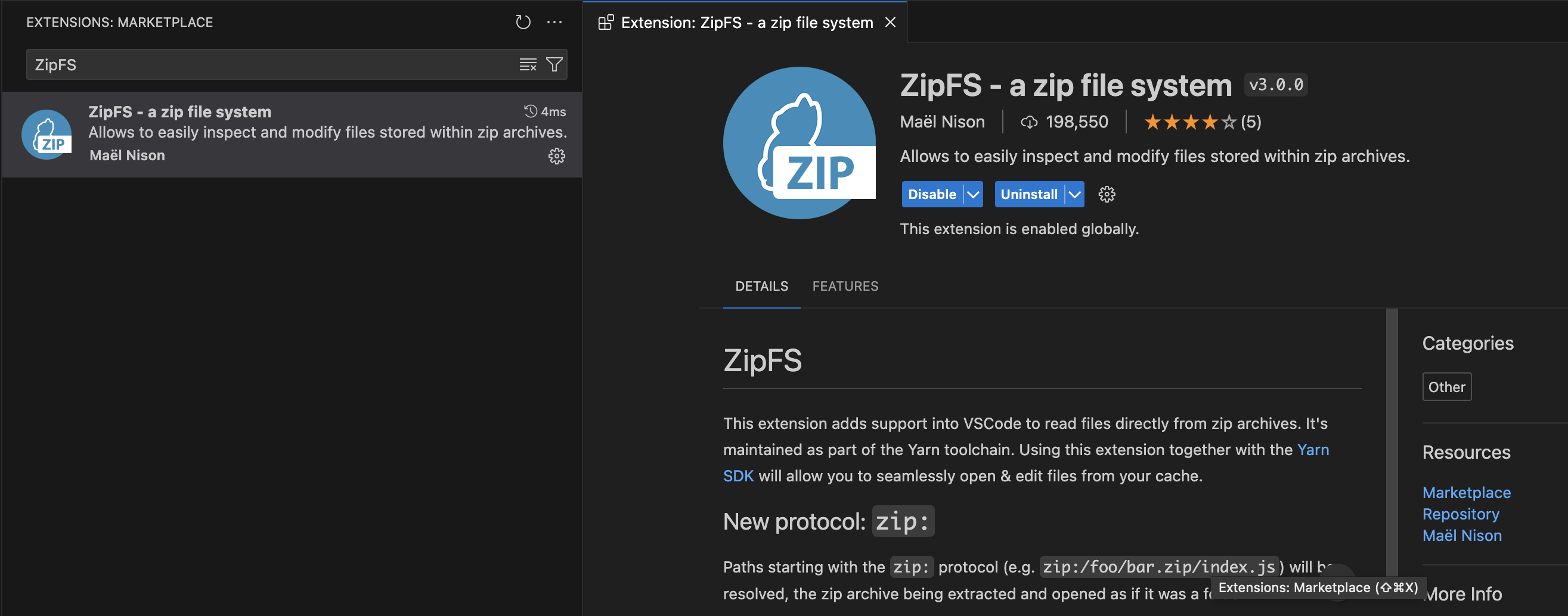 ZipFS는 VSCode가 zip파일을 읽기 가능하게 만드는 확장 프로그램이며 Yarn의 메인테이너인 Maël Nison이 작성했다.
