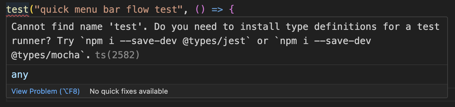 Cannot find name 'test'. Do you need to install type definitions for a test runner? Try `npm i --save-dev @types/jest` or `npm i --save-dev @types/mocha`.ts(2582)