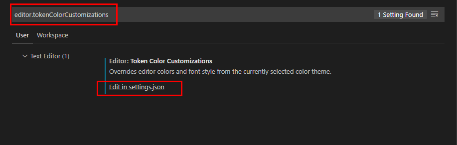 그리고 입력창에 'editors.tokenColorCustomizations' 라고 입력하게 되면 Edit in settings.json이라는 텍스트 링크가 나오게 되는데 이것을 클릭합니다.