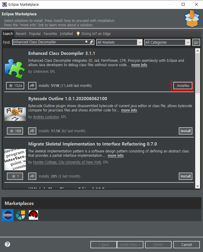 installed 탭에서 디컴파일러가 정상적으로 설치되어있는지 확인한다. 만약 설치가 안되어있는경우 아래와 같이 설치해준다.