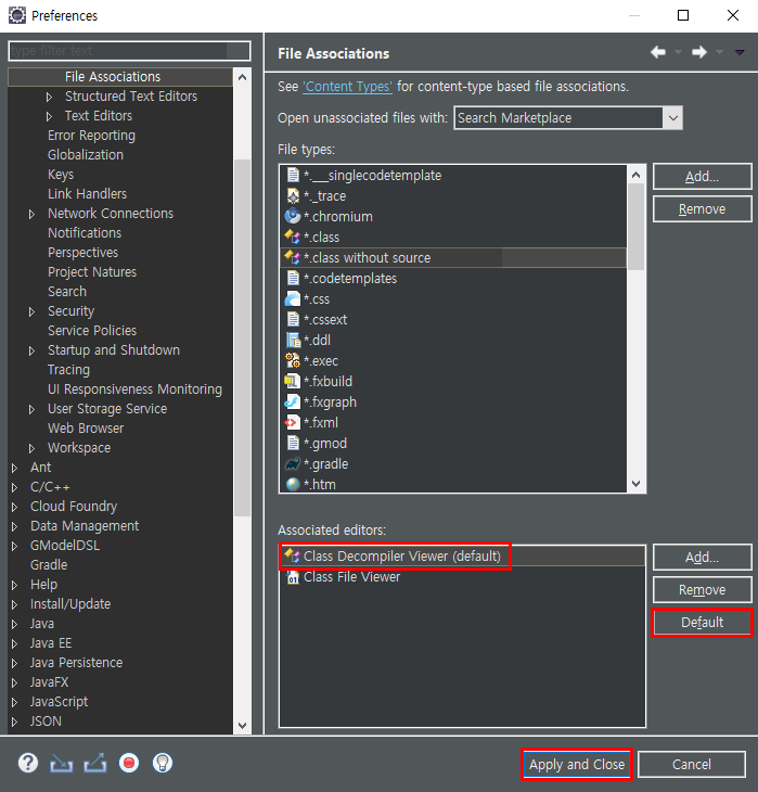 2. 추가한 Class Decompiler Viewer를 Default버튼을 클릭해 기본값으로 설정한 다음 Apply and Close를 눌러 적용해주면, class 파일을 열었을 때 정상적으로 디컴파일된 결과를 확인할 수 있다.